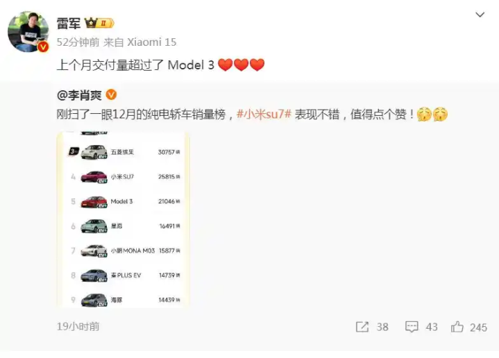 近日,小米集团董事长兼CEO雷军转发了小米汽车副总裁李肖爽的微博,分享了小米SU7在2024年12月的亮眼销售数据。数据显示,小米SU7当月交付量高达25,815辆,成功超越了特斯拉Model 3的21,046辆,跻身纯电轿车销量榜前列。这一成绩无疑是对小米SU7产品实力和市场认可度的最好证明。